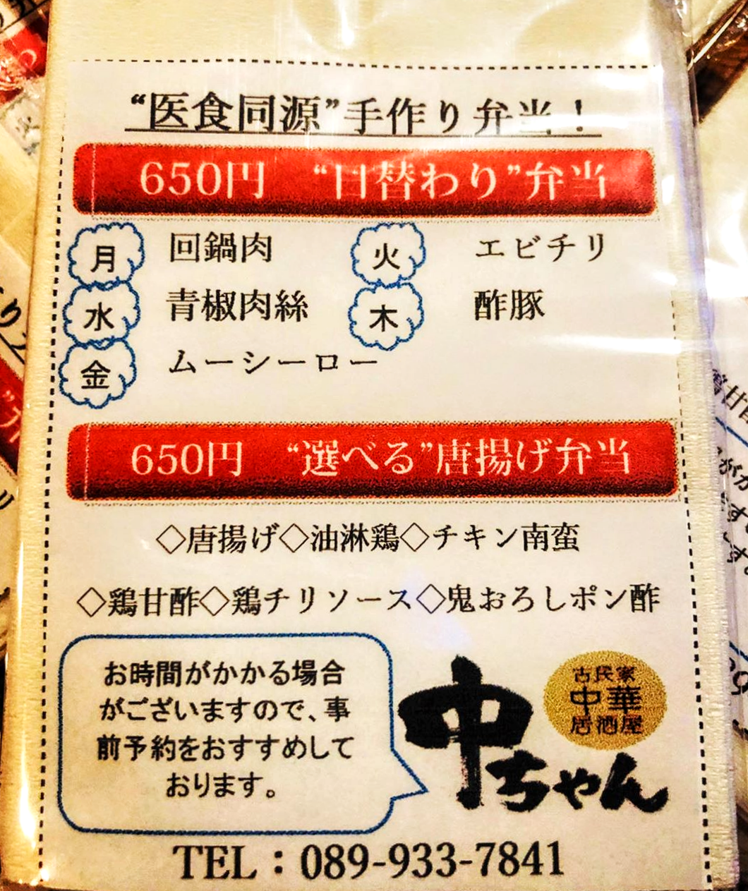 転載▶【テイクアウト】『古民家中華居酒屋 中ちゃん』ムーシーロー弁当(松山市)