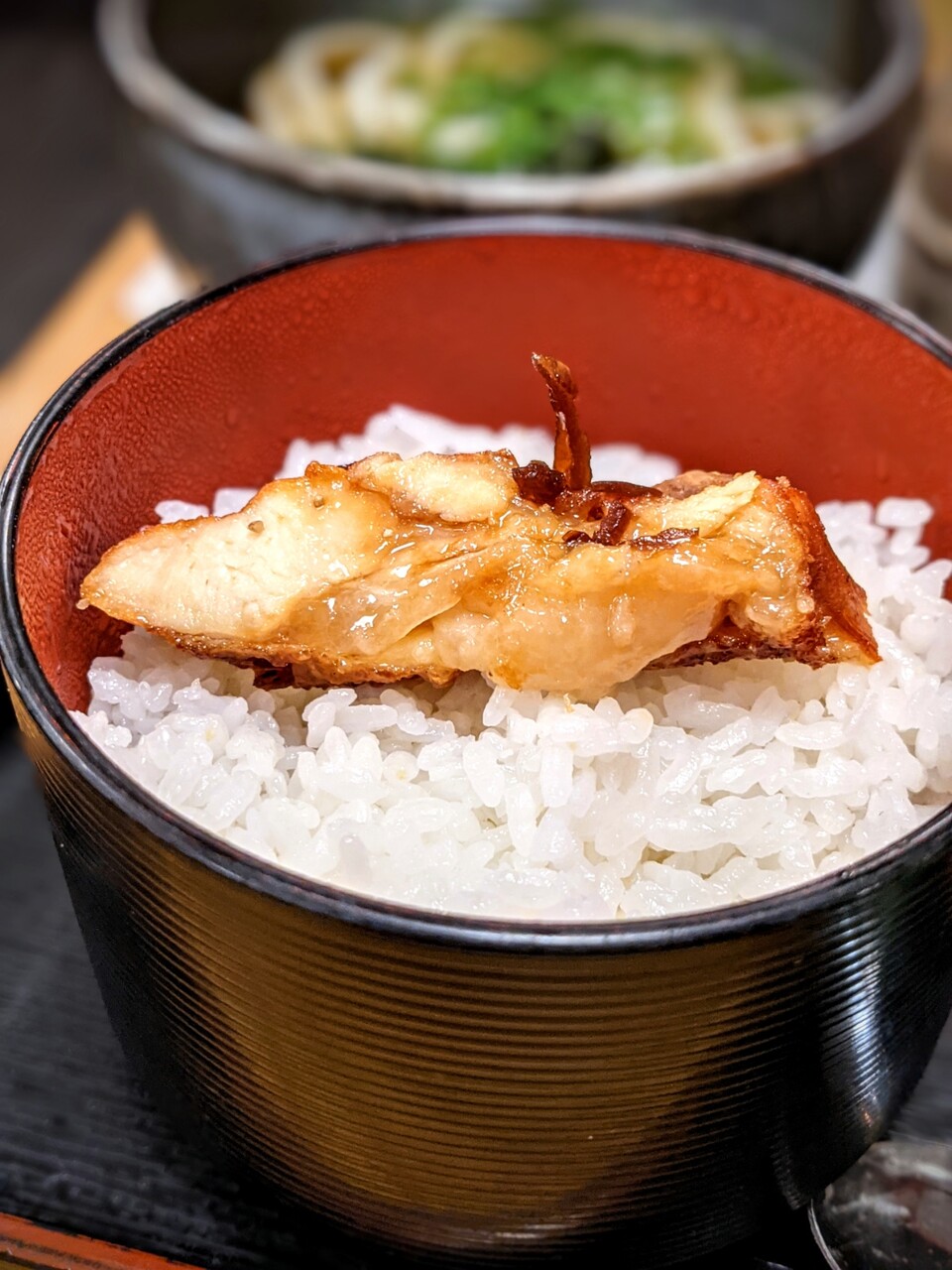 甘辛い醤油で味付けされていて、照り焼きチキンのような仕上がり
