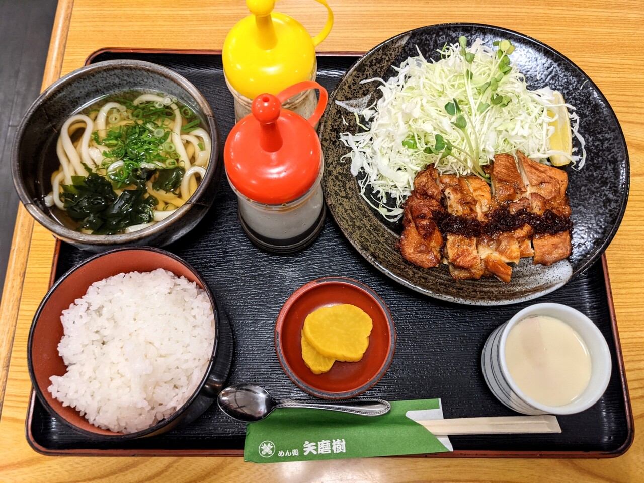 矢磨樹さんのメニューの中でも比較的新しい【チキンステーキ定食】チキンステーキは鶏肉の表面がこんがり焼き上がっていて食欲をそそる♪