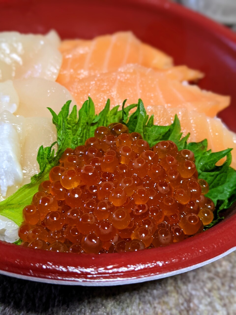 酢飯の上にトッピングされた食材は、ホタテ・サーモン・イクラ