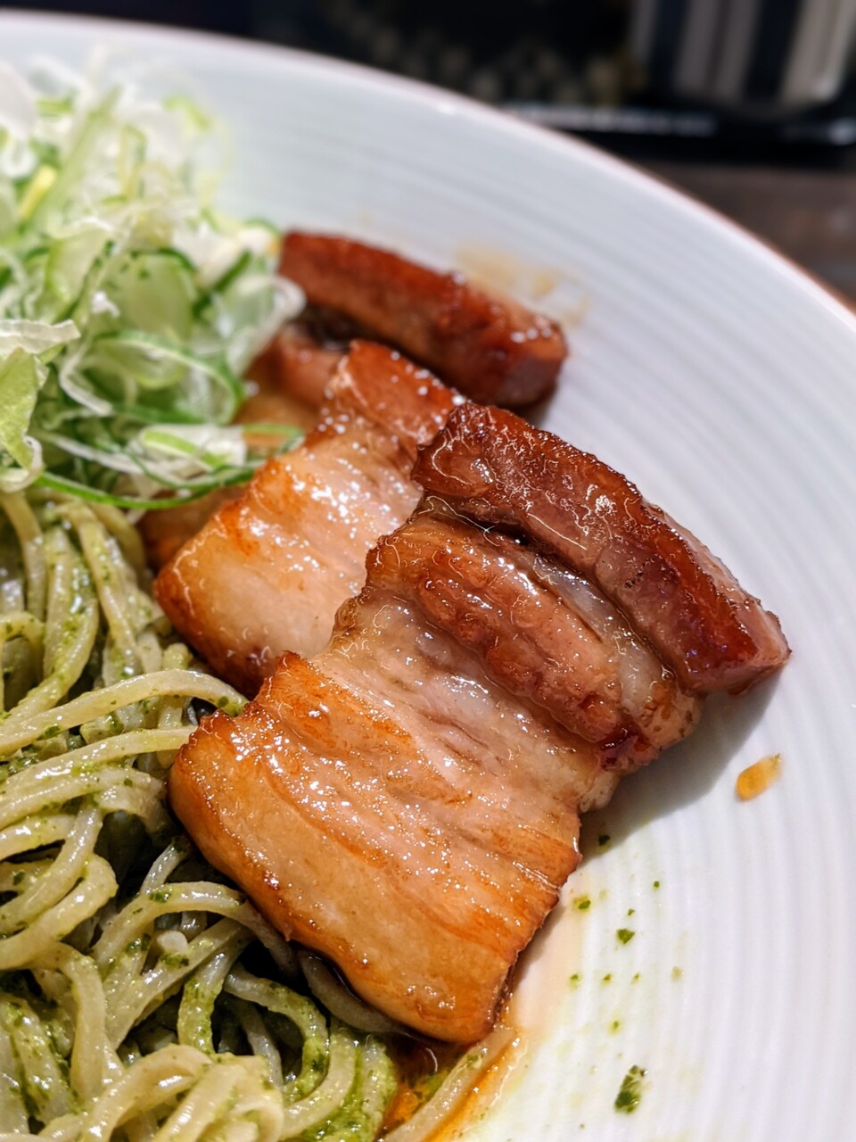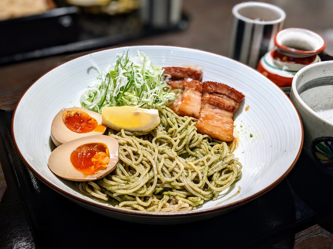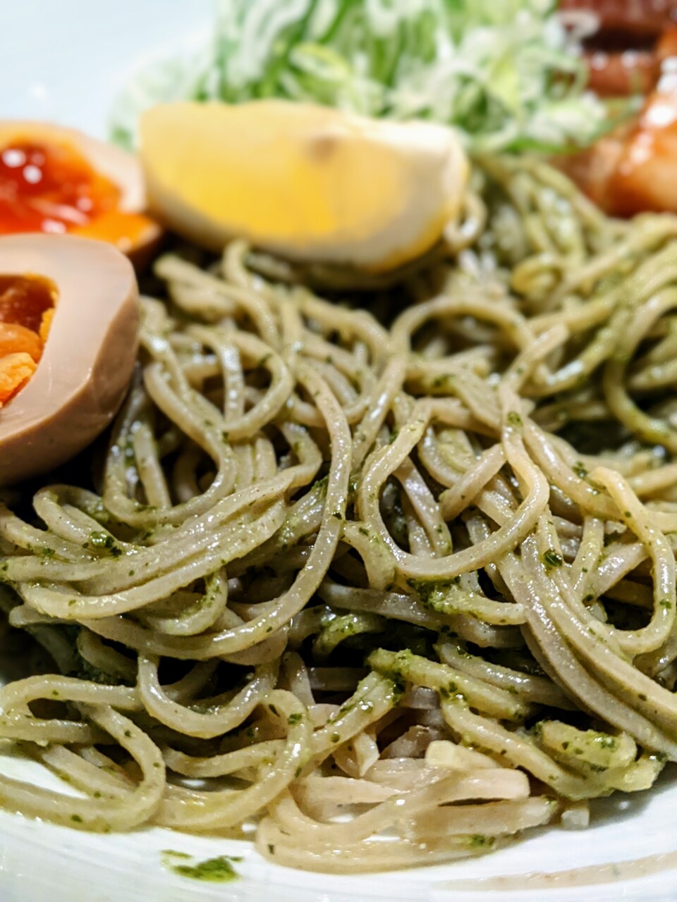 転載▶『井上のそば屋のはなれ』豚バラチャーシューのバジルつけそば(松山市)