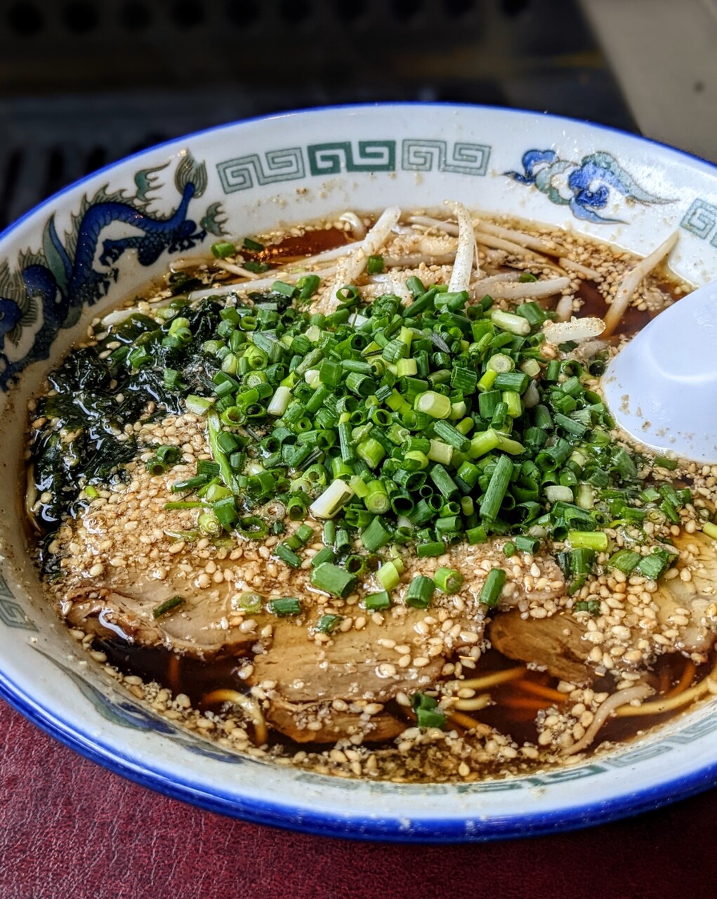 チャーシュー・ワカメ・もやし、たっぷりのネギと白胡麻