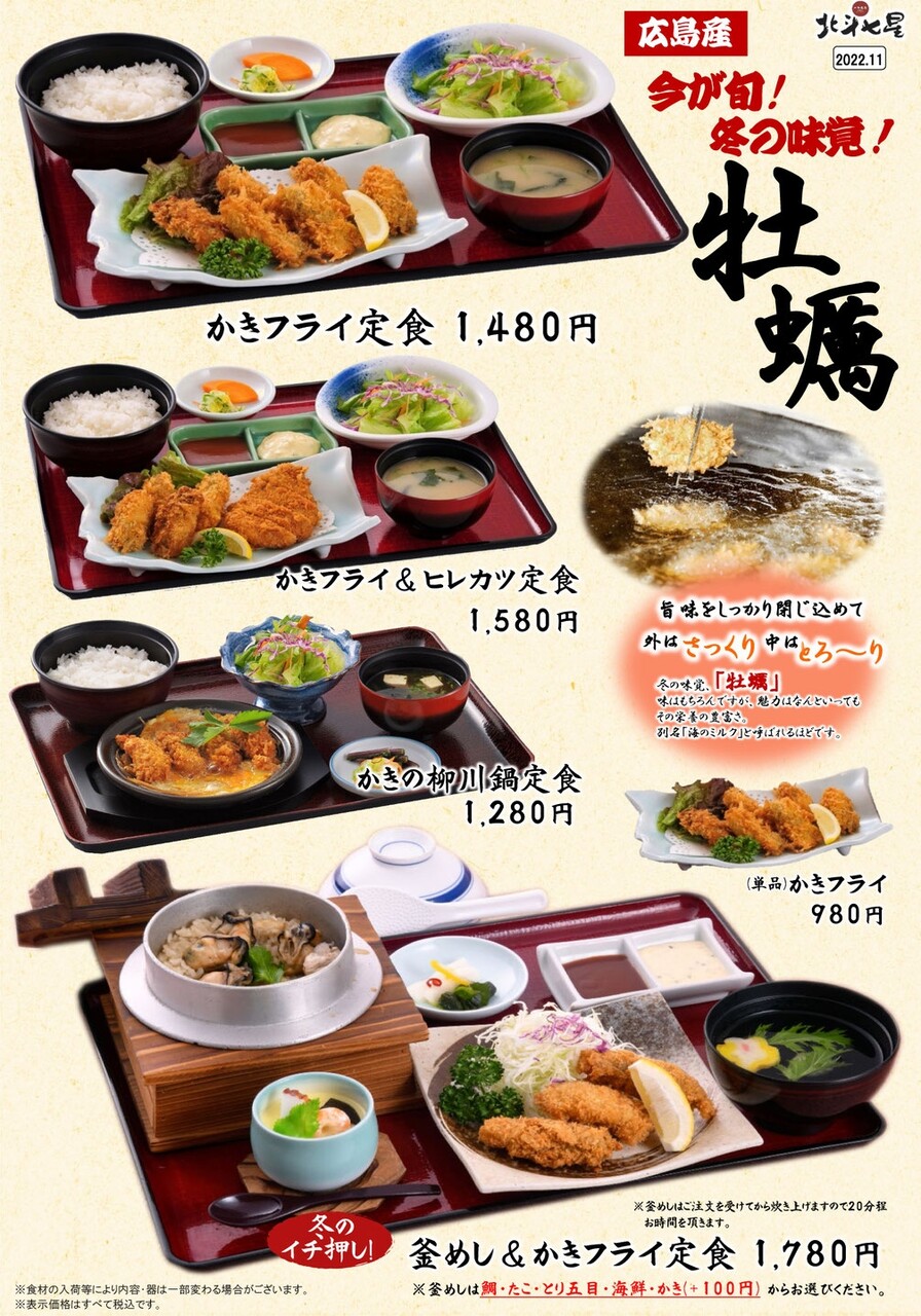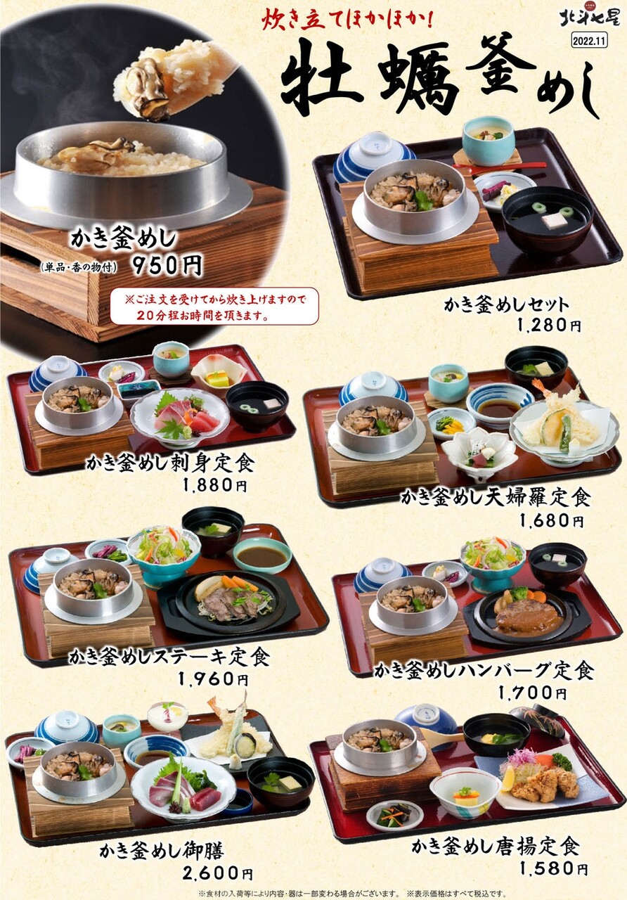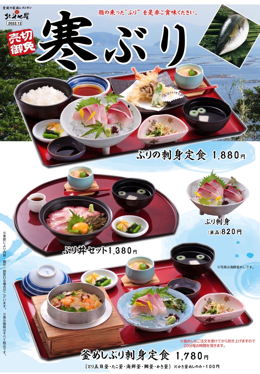 冬季限定メニューは他にも牡蠣を使った釜飯、寒ブリの刺身の定食がラインナップ