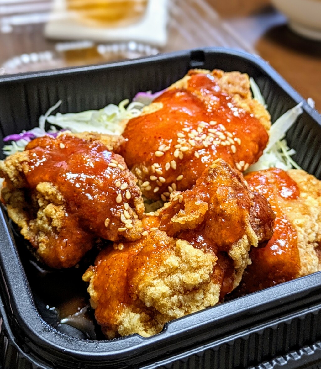 韓国グルメのヤンニョムチキン風の唐揚げがトッピングされた丼メニュー